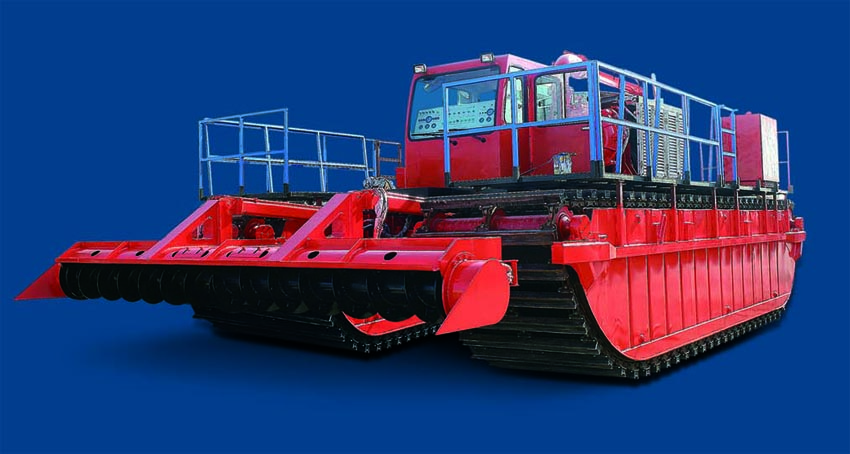 XWQY100型兩棲旋挖式清淤機(jī)是應(yīng)用戶要求而專門設(shè)計(jì)的一種大型池塘水下清淤機(jī)械。該機(jī)以浮箱履帶為基礎(chǔ)實(shí)施工作移位,用旋挖頭切割和收集水下淤泥,用泥漿泵將泥漿吸走并排出,送到指定的排泥場,從而實(shí)現(xiàn)對大型池塘清淤的目的。 該機(jī)也可用于其他具有相似條件的河道、溝渠等淺水水域進(jìn)行清淤作業(yè)。