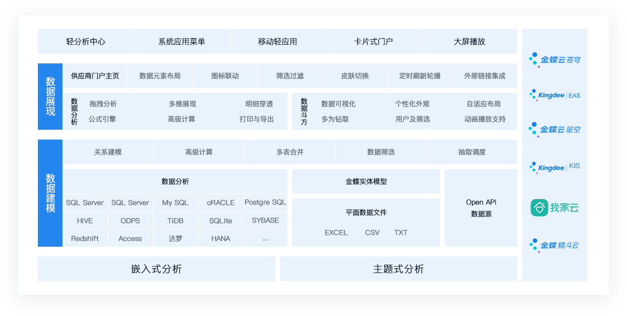 金蝶云·蒼穹數(shù)據(jù)服務(wù)云——輕分析,是金蝶自主研發(fā)的,擁有獨(dú)立知識(shí)產(chǎn)權(quán)和核心技術(shù)的數(shù)據(jù)云計(jì)算引擎和數(shù)據(jù)可視化平臺(tái),為業(yè)務(wù)人員提供了一種輕建模、多維度、高性能的數(shù)據(jù)分析和數(shù)據(jù)探索平臺(tái)