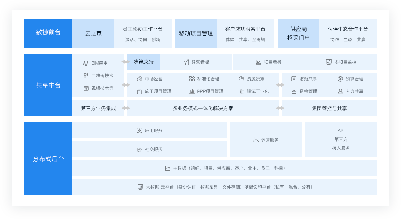 支持建筑企業(yè)產(chǎn)業(yè)鏈一體化、多元化發(fā)展戰(zhàn)略與商業(yè)模式的創(chuàng)新,為企業(yè)打造了一個多業(yè)務(wù)模式、產(chǎn)業(yè)鏈一體化、共享與生態(tài)的企業(yè)統(tǒng)一信息化管理平臺