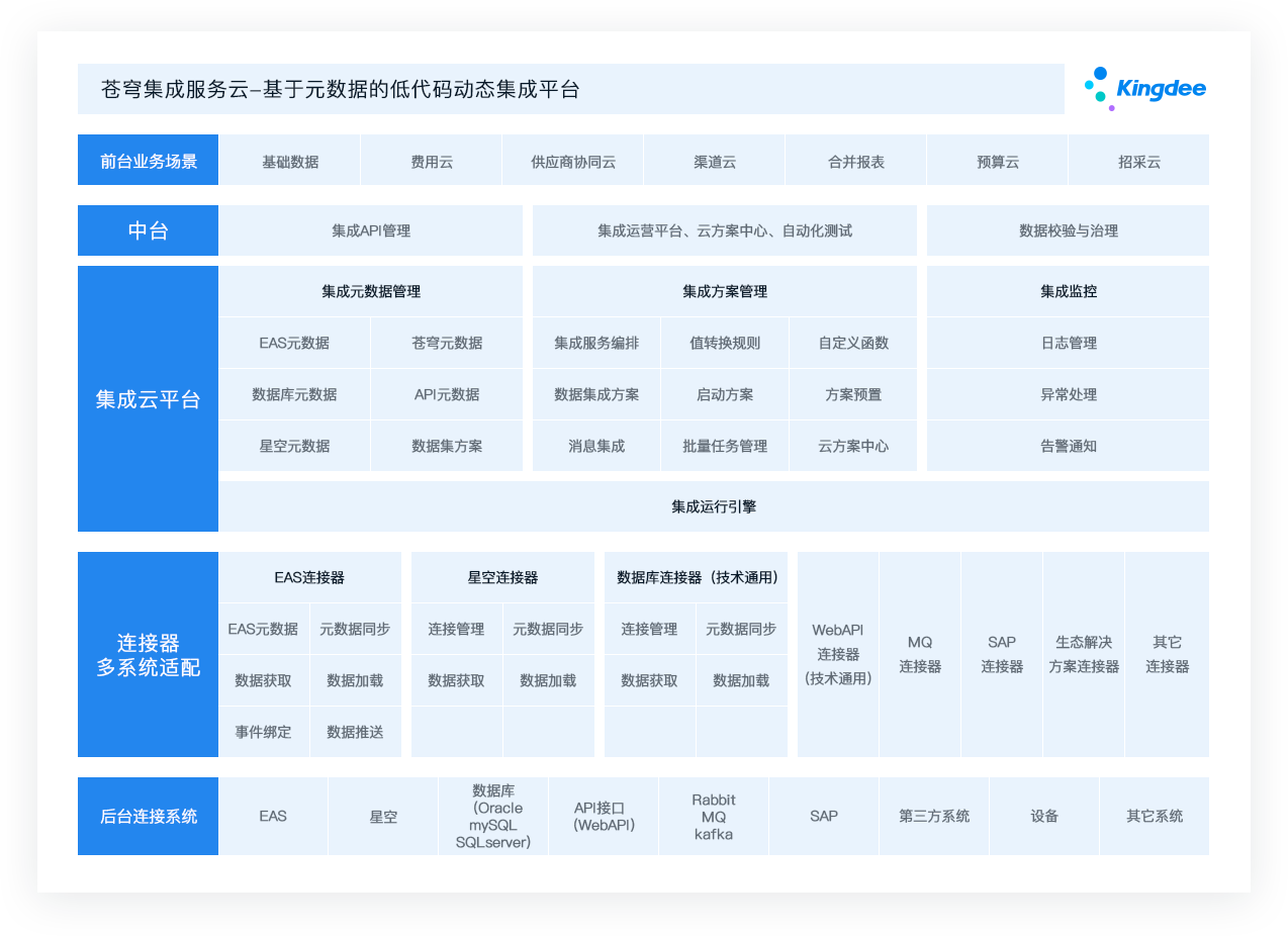 聚焦大型企業(yè)各類系統(tǒng)與金蝶云·蒼穹集成的需求, 采用元數(shù)據(jù)驅(qū)動(dòng)的設(shè)計(jì)模式,通過(guò)低代碼可視化配置、豐富的值轉(zhuǎn)換規(guī)則和開(kāi)放的對(duì)外服務(wù)能力,快速實(shí)現(xiàn)客戶的動(dòng)態(tài)集成需求,讓集成開(kāi)發(fā)簡(jiǎn)單、執(zhí)行過(guò)程可靠、問(wèn)題風(fēng)險(xiǎn)可控。支持用戶自行擴(kuò)展webAPI自定義型連接器,以滿足不同類型第三方系統(tǒng)的集成